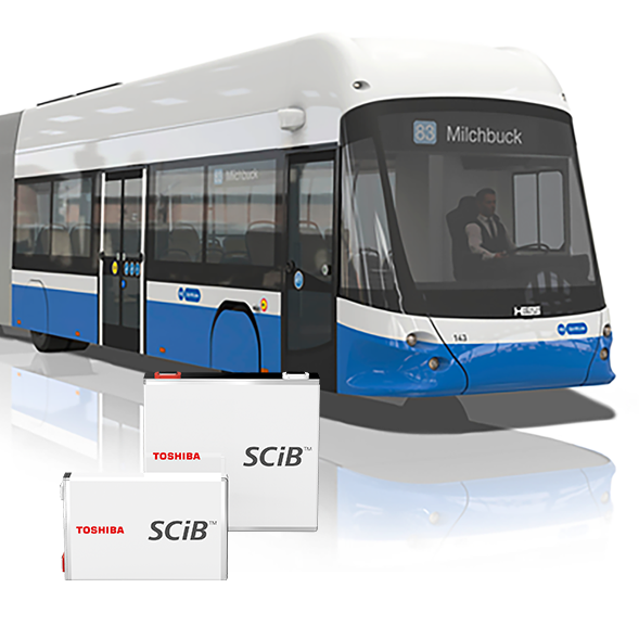 Toshiba has met this challenge by developing a lithium-ion battery that uses lithium titanium oxide (LTO) in its anode. Using LTO in the anode, SCiB™ offers excellent characteristics, including safety, long life of over 20,000 charge/discharge cycles, low-temperature performance, rapid charging, high input/output power and wide usable State of Charge range. Critically, with SCiB™ there is a very low risk of fire or explosion from internal short circuits. These technical attributes make these lithium titanium oxide batteries ideal for sustainable use in e-mobility environments, such as buses, heavy-duty vehicles and mining trucks, railroad cars, and passenger ferries.